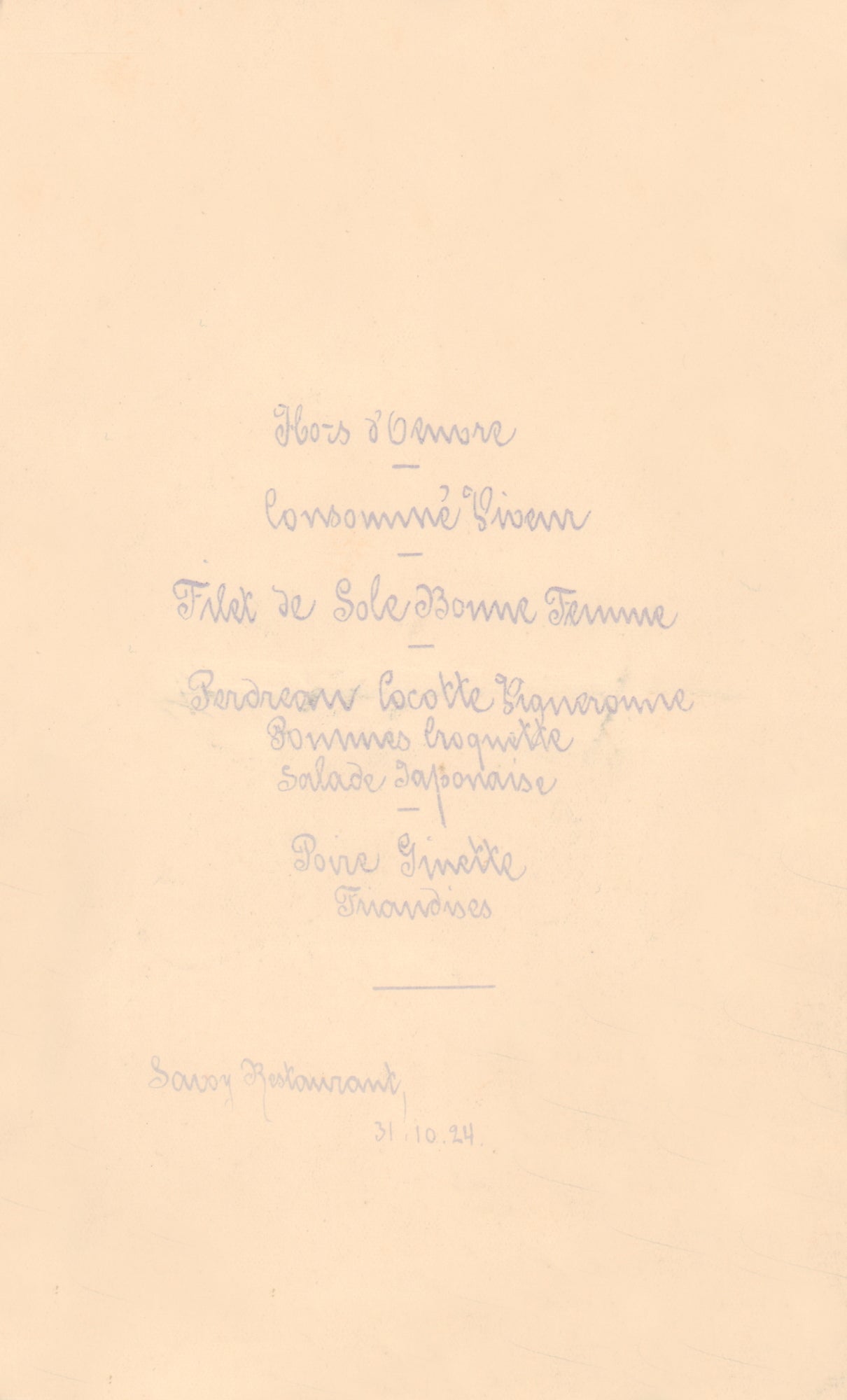 Even after Ritz and Escoffier left, The Savoy remained a high society favorite and was on the radar of many rich and self-made American visitors. This lovely vintage menu cover, dated 1924, was for a private luncheon shared by a group of friends on a European tour. Beautifully designed with a period motif, they were probably kept by one of the guests as a souvenir and brought back to the US.